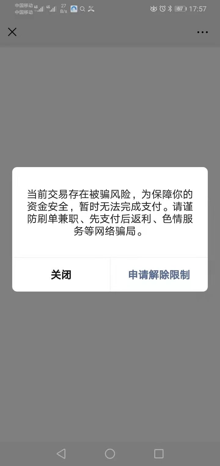 当前交易存在被骗风险,为保障你的资金安全,暂时无法完成支付。请谨防刷单兼职、先支付后返利、色情服务等网络骗局。