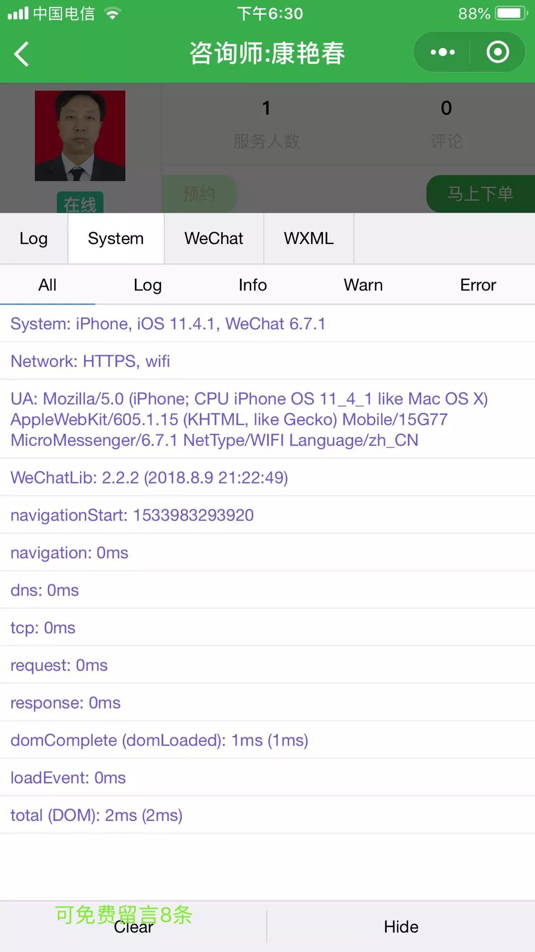 1:小程序可用性和完整性不符合规则:(1):小程序【咨询】核心功能点击无响应,请优化后再提交审核(测试环境wifi,IOS11.4,微信6.7.1,iPhone6)