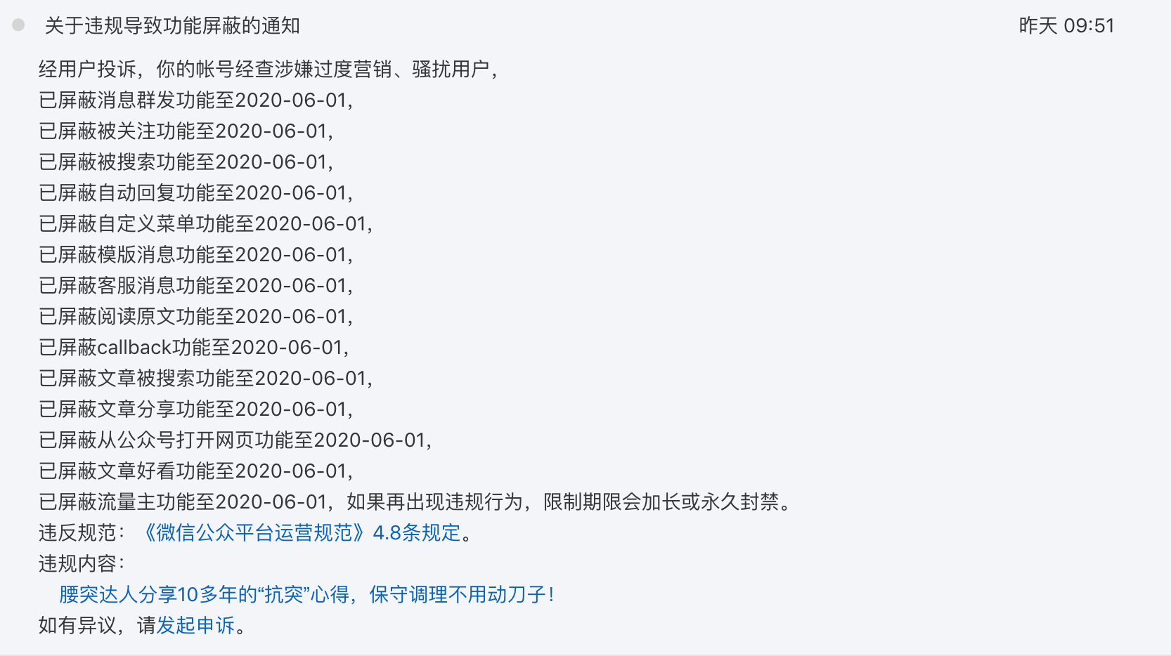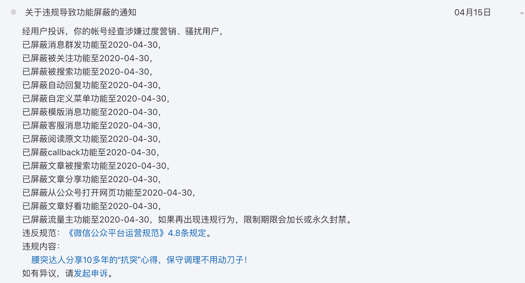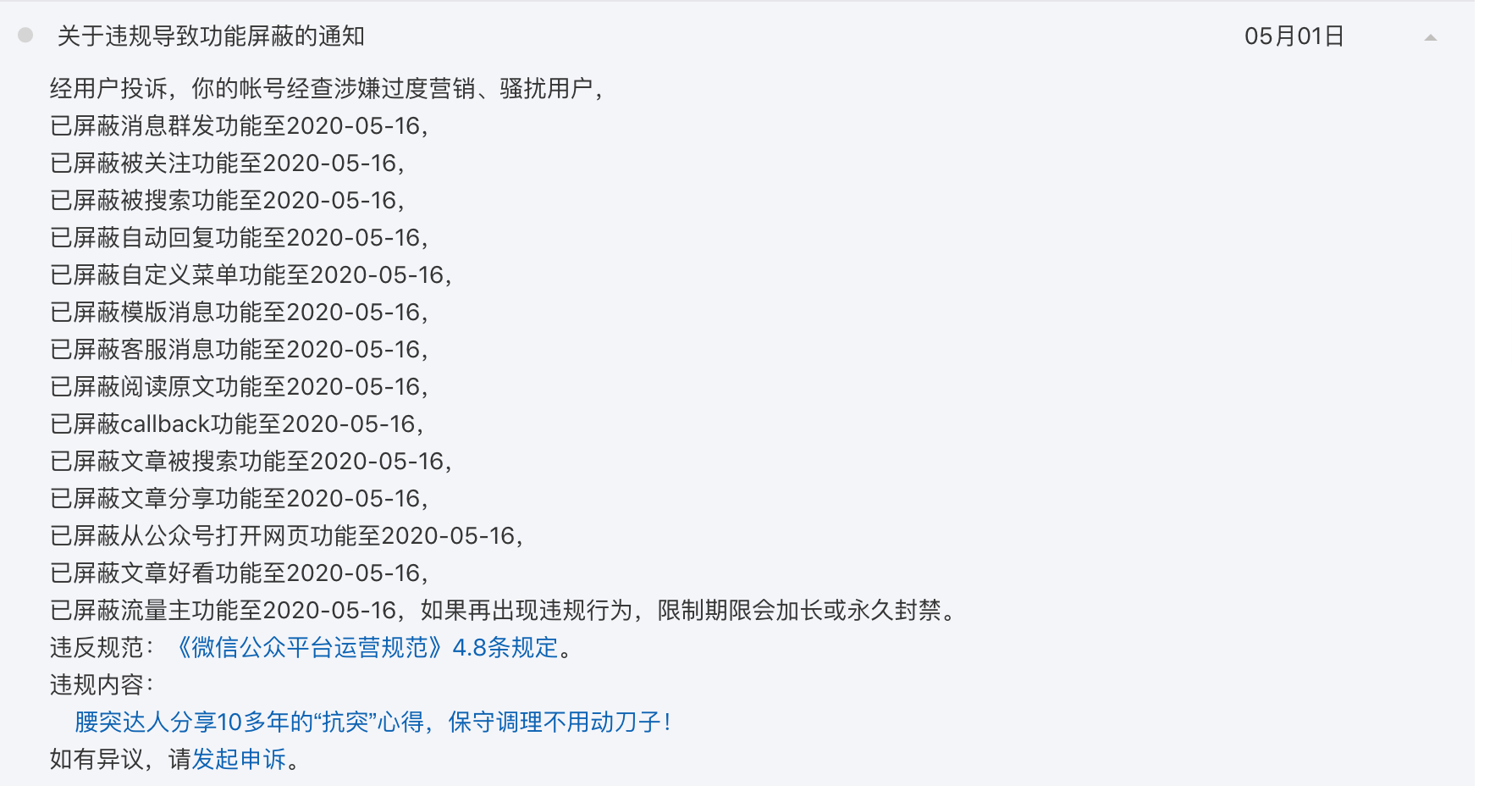 您好,我想问下为什么我的微信公众号因同一个违规内容被接连屏蔽3次?该违规内容在第一次收到通知时就已经删除了