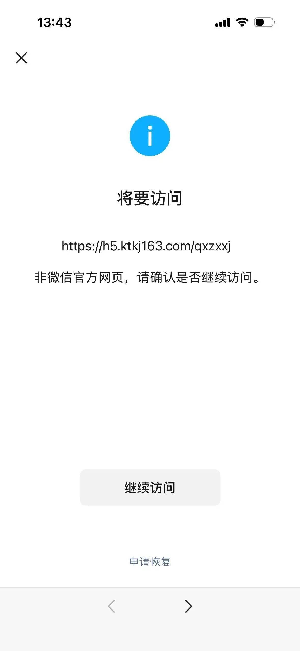 您好,域名(https://h5.ktkj163.com/qxzxxj)域名在腾讯云注册并备案通过,服务器也在腾讯云,浏览器访问正常,我是网站开发者,访问时间如图微信访问网站出现“非微信官方网页,请确认是否继续访问”,经检查网页里没有不安全的内容,是微信官方网页,请核实后帮忙解除拦截,谢谢!