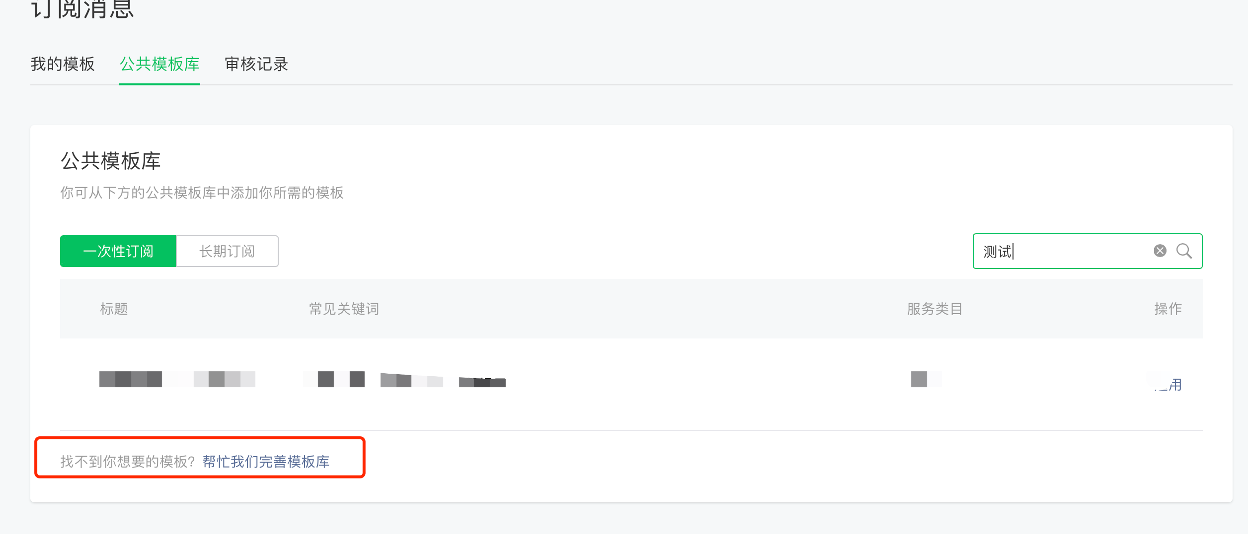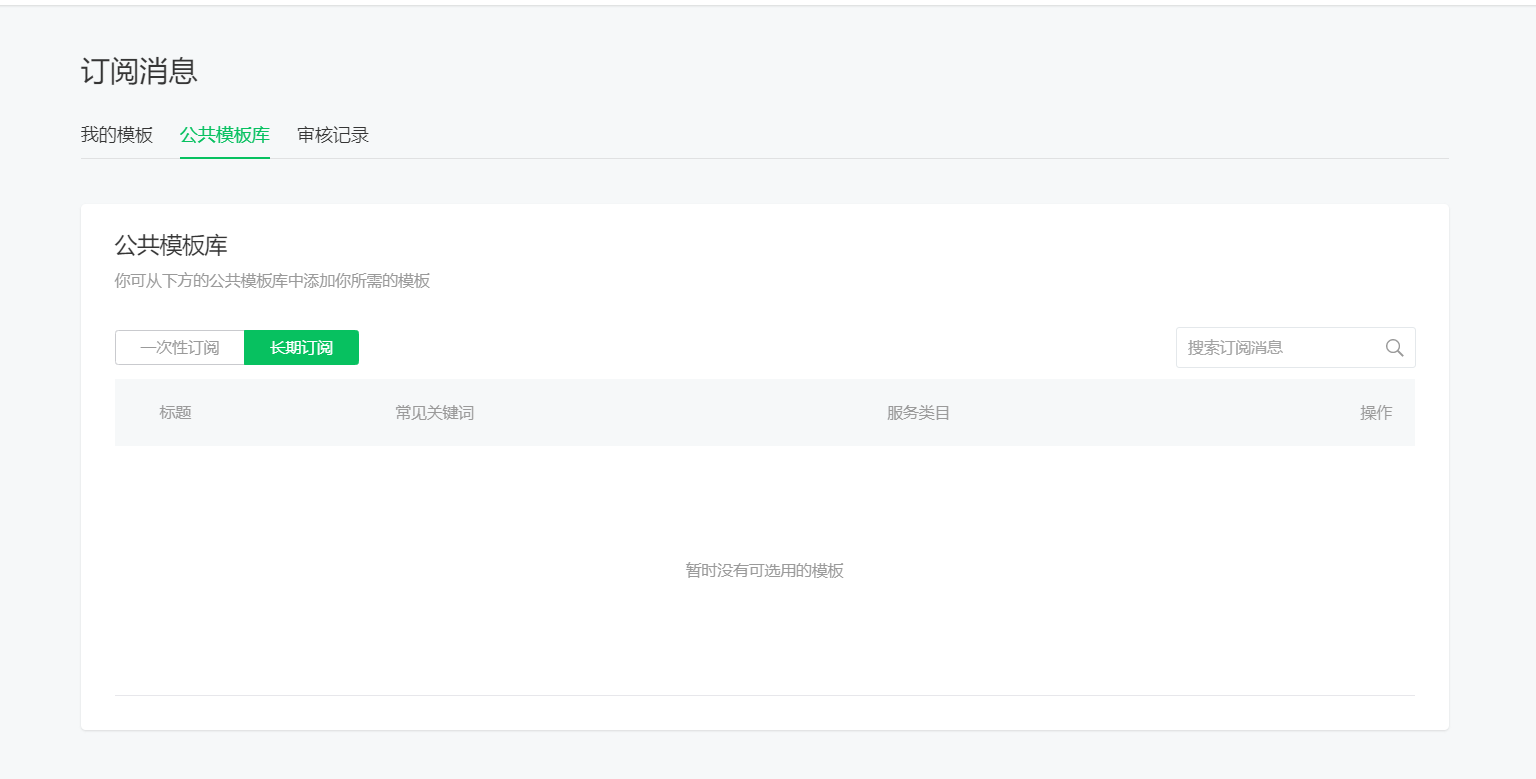 目前长期订阅模板没有提供申请方式,可以参考这个回复:长期订阅模板库中没有模板也不让申请模板怎么弄?? moke 的回答 - 微信开放社区 https://developers.weixin.qq.com/community/develop/doc/0000e499b70ce03566592caf356000?_at=1572514710495&jumpto=comment&commentid=00088a75974308066359e21425b4
