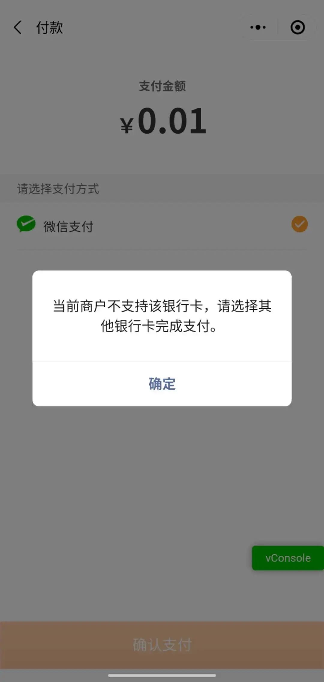 微信支付 选择信用卡支付 提示当前商户不支持该银行卡点击确认后 android手机界面上无法操作 ios手机上无错误回调