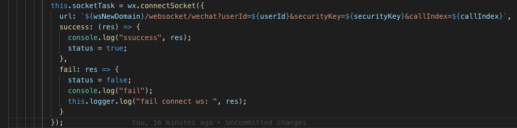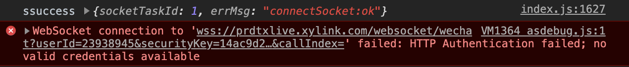 如图,小程序连接ws,由于数据问题,ws连接失败,返回401未授权错误,但是回调确走到了success函数中,明显不对。并且返回的socket task 对象竟然也有值。