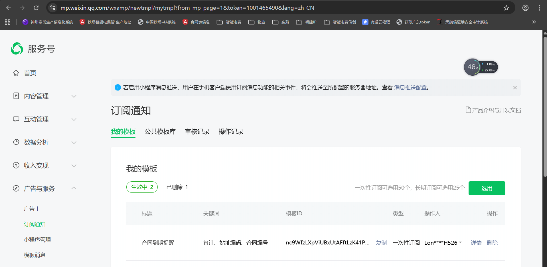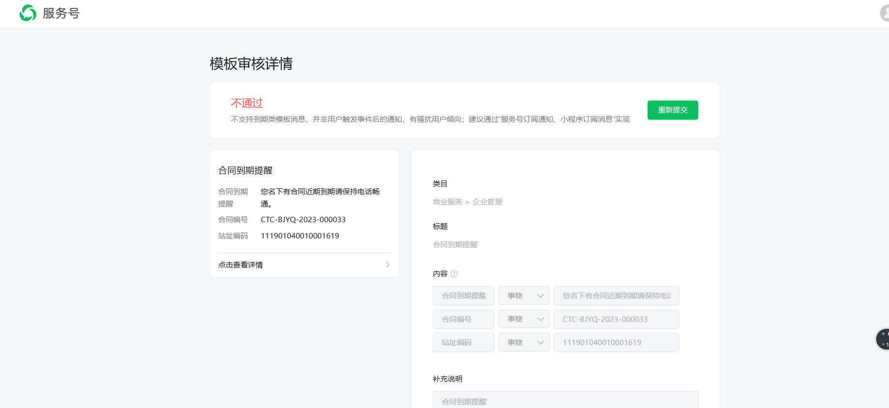 老师您好 我申请模版消息这个合同续签提醒也不通过服务号也不让调用订阅消息模版,,这个要怎么处理呢