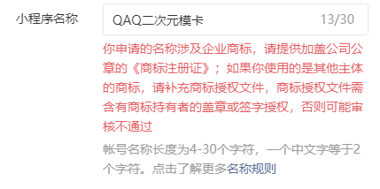 填写小程序名称时,提示名称中涉及企业商标,经过尝试发现涉及商标的字为“模卡”。我们查询到“模卡”确实被注册了商标,但是这是一个通用词汇,且我们小程序的主要功能也是制作模卡,名称无法用其他词汇替代,故想咨询这种情况该如何处理?