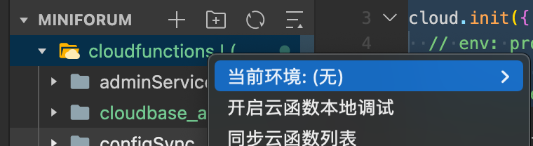 你好,目前共享的环境,不能在 cloudfunctions 上右键选择;找不到环境确认下是否有cloudbase_auth 云函数,具体参考文档https://developers.weixin.qq.com/miniprogram/dev/wxcloud/guide/resource-sharing/guidance.html,建议按照文档示例来写。