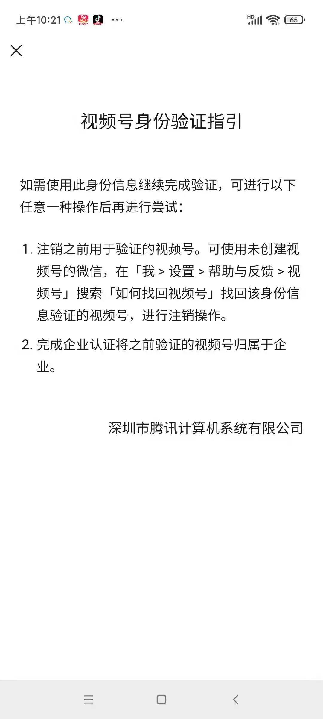 提示需要真人出境,按流程操作之后,有时候提示系统繁忙,有时候又提示如下页面,一个身份证能认证视频号?
