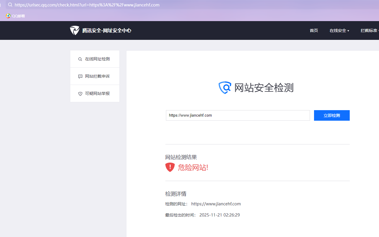 你好,经核实域名【jiancehf.com】被手机管家拦截,本系统只处理被微信暂停提供微信内直接访问的服务的外部链接的申诉问题,若非前述事宜,将不予答复。建议登录手机管家官网【http://gj.qq.com/online_server/complain_url.html】自行申诉,知悉。