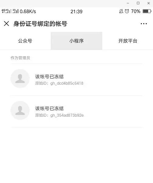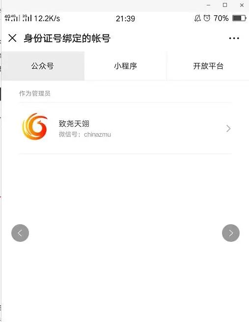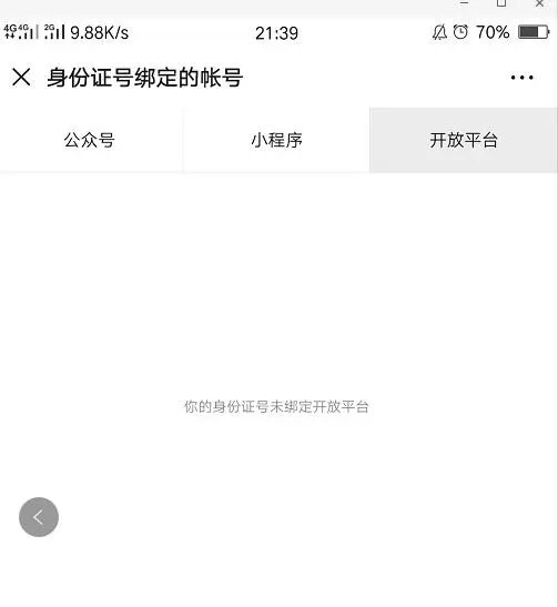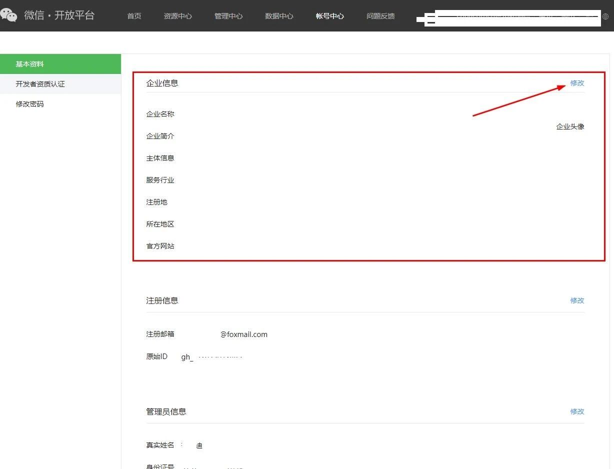 根据相关的说明,已经尝试查看过,在公众平台安全助手中使用身份证+微信账号等方式查询到我的身份证名下有2个开放平台账号,且微信账号名下也是2个,身份证和微信名下的邮箱账号相同,其次,根据查询得到的结果使用该邮箱登陆之后,点击账户中心,出现的界面为:
