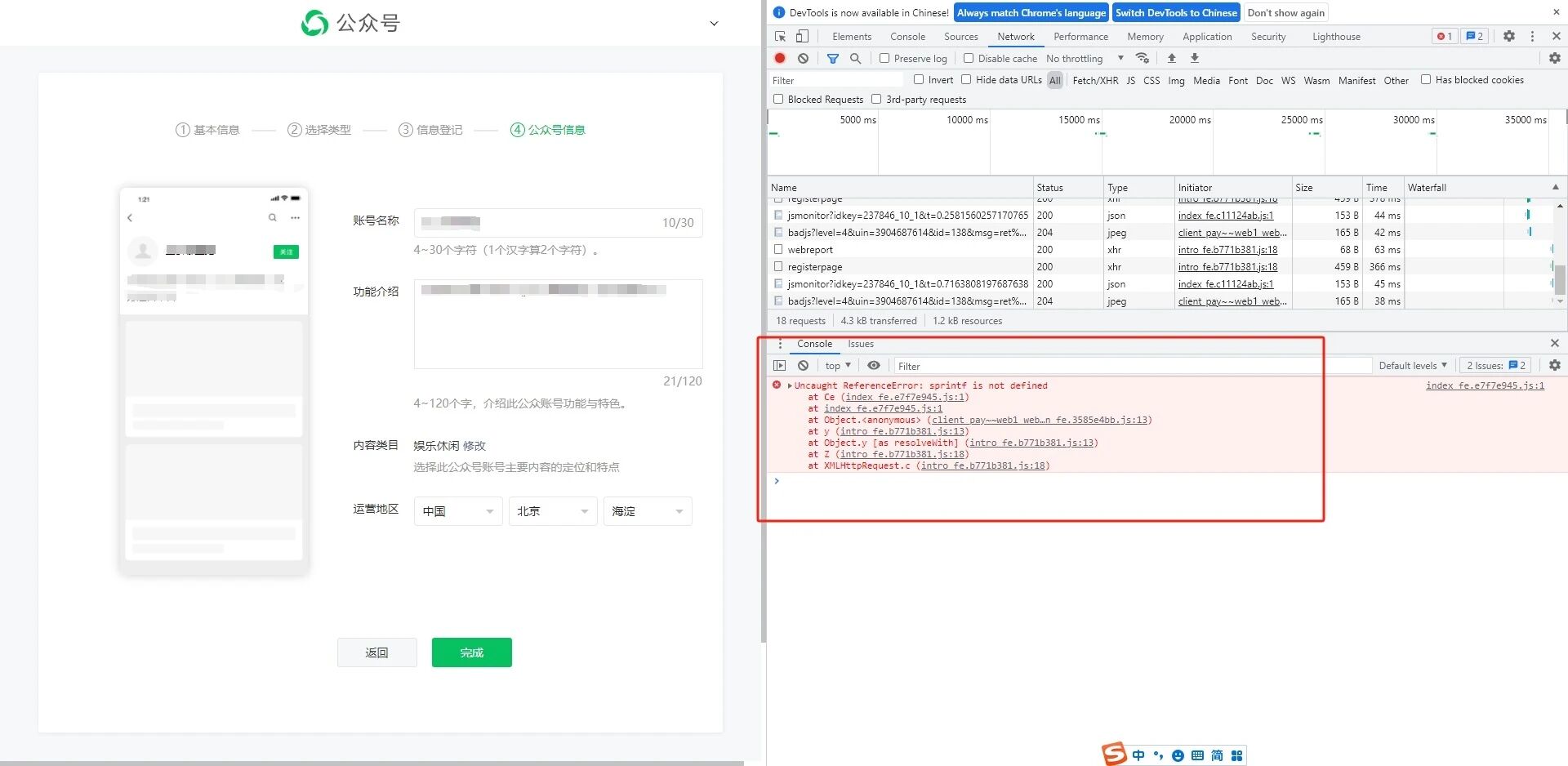 申请新的公众号(订阅号)时,到了最后一步“填写公众号信息”。 填写好信息之后,点“完成”按钮,页面没有任何反应。 打开控制台后发现页面报错。