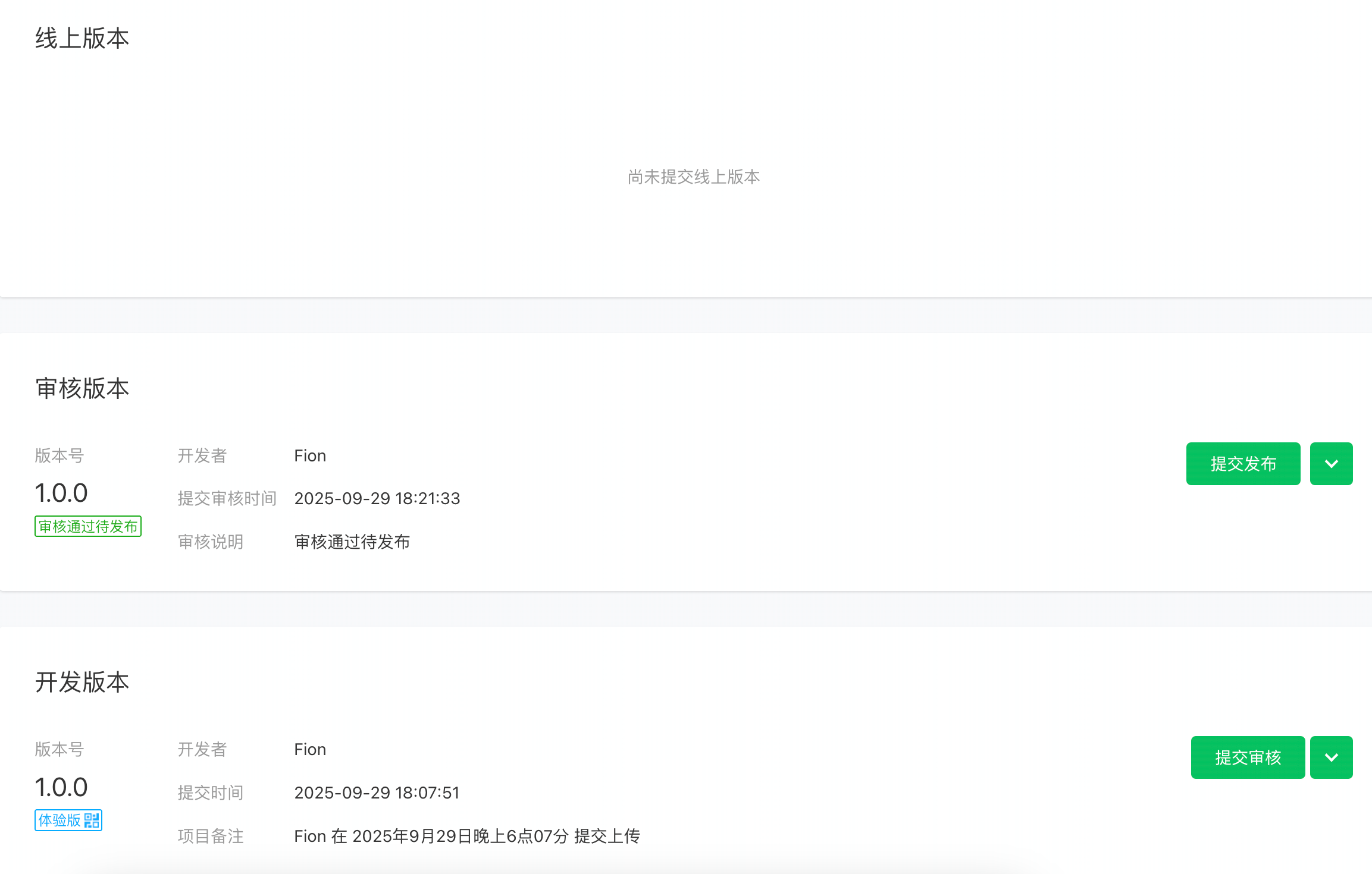 这是我小程序状态,没发布过,但是审核通过了,现在在测试阶段!