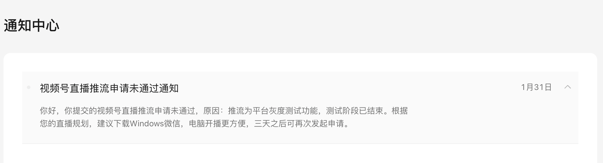 我司希望通过视频号做直播,未来话题关于“企业如何落地大模型”,因为受众都是国内大企业,用Windows开播画质十分模糊,培训教程展示的体验非常差。连夜申请了直播推流权限被拒绝了,原因是灰度测试。