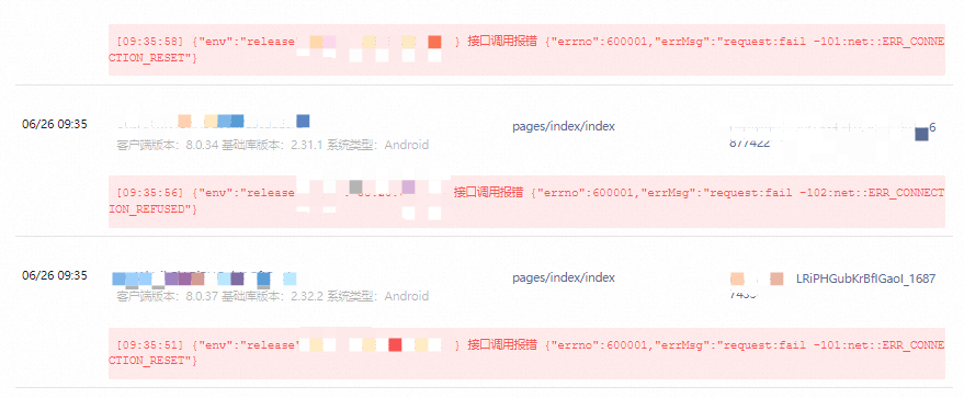 在进入小程序时,后台日志中很多请求都是request:fail -101:net::ERR_CONNECTION_RESET。