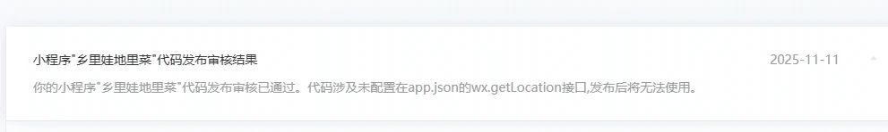 代码发布审核已通过。代码涉及未配置在app.json的wx.getLocation接口,发布后将无法使用