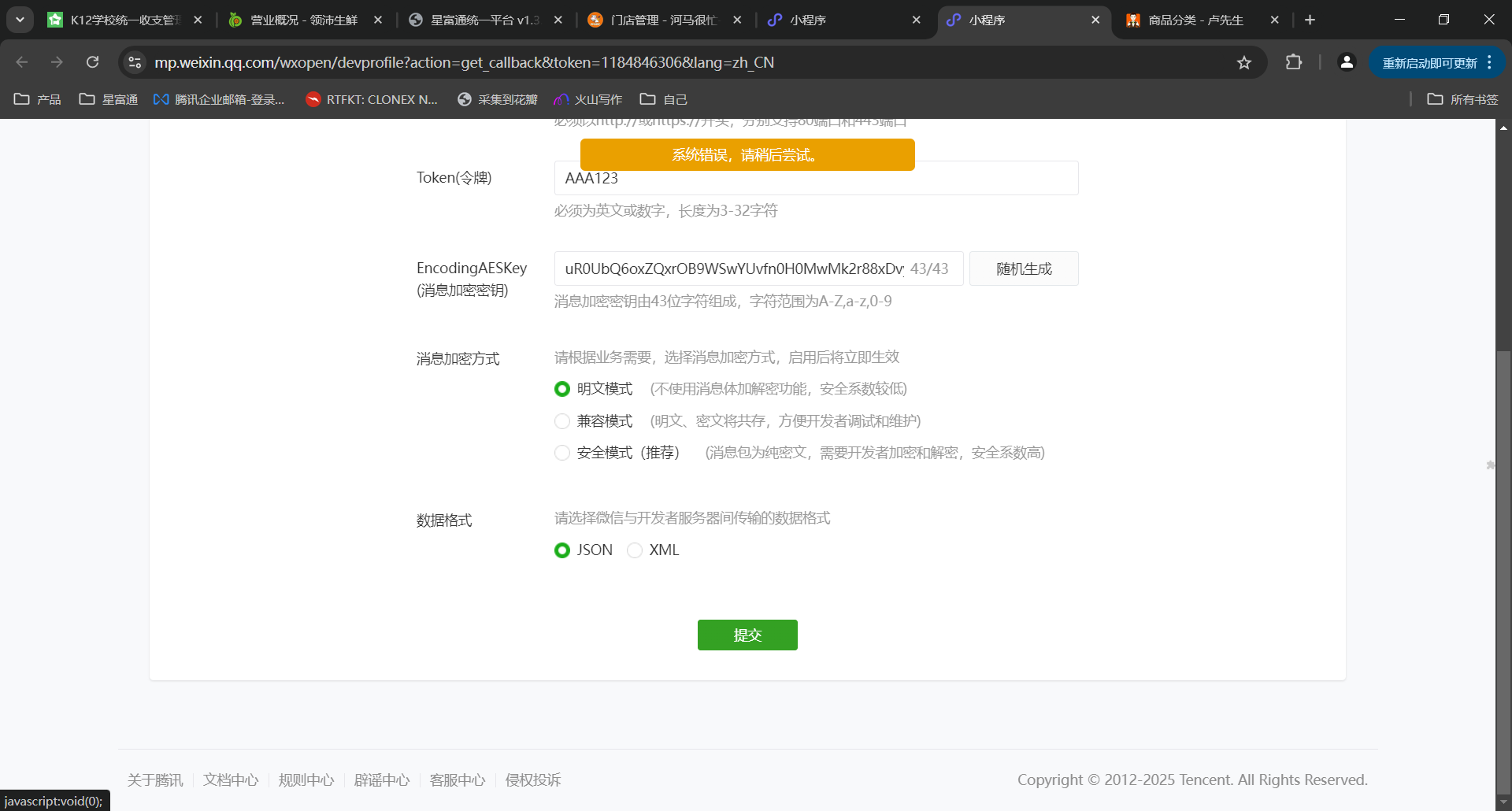 登陆小程序管理后台,在「开发」-「开发管理」-「消息推送配置」中配置通知地址返回系统错误,请稍后尝试