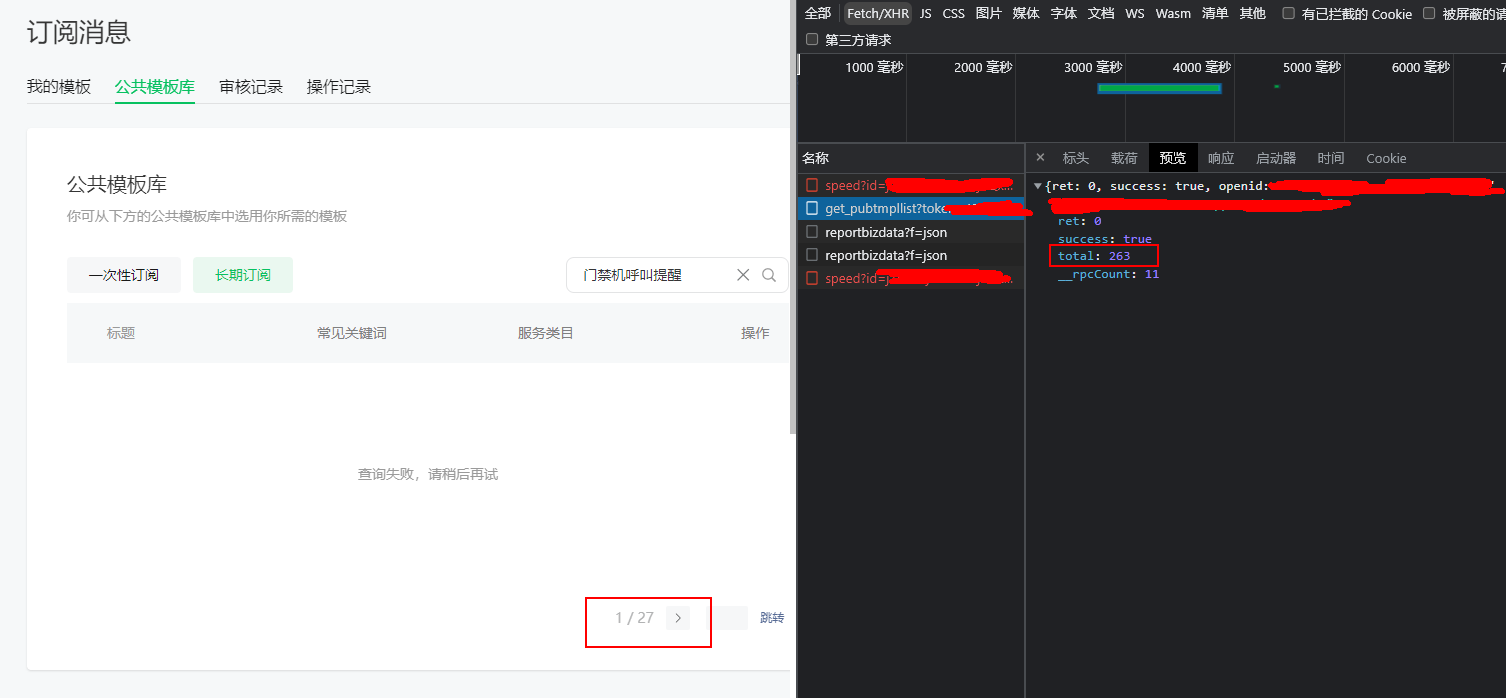 进入管理后台,订阅消息-公共模板库-长期订阅,搜索“门禁机呼叫”,从接口返回中显示有total,但是显示“查询失败,请稍后再试”