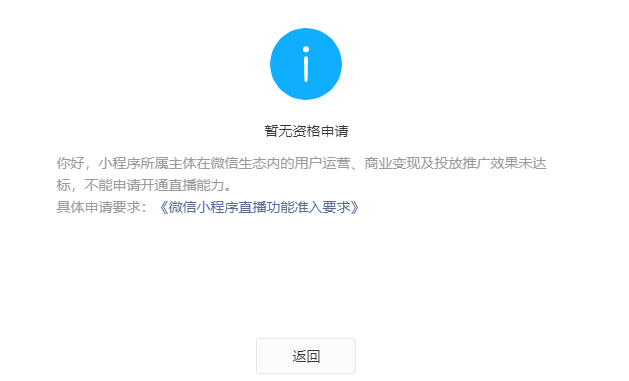 错误提示:你好,小程序所属主体在微信生态内的用户运营、商业变现及投放推广效果未达标,不能申请开通直播能力。
