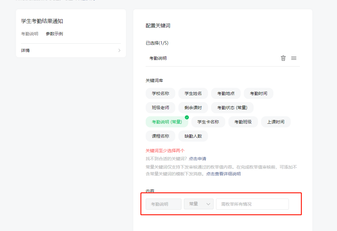 你好,建议通过账号后台添加常量关键词,添加后需将枚举值提交平台审核通过后方可下发,审核通过前可以下发不含常量关键词的模版