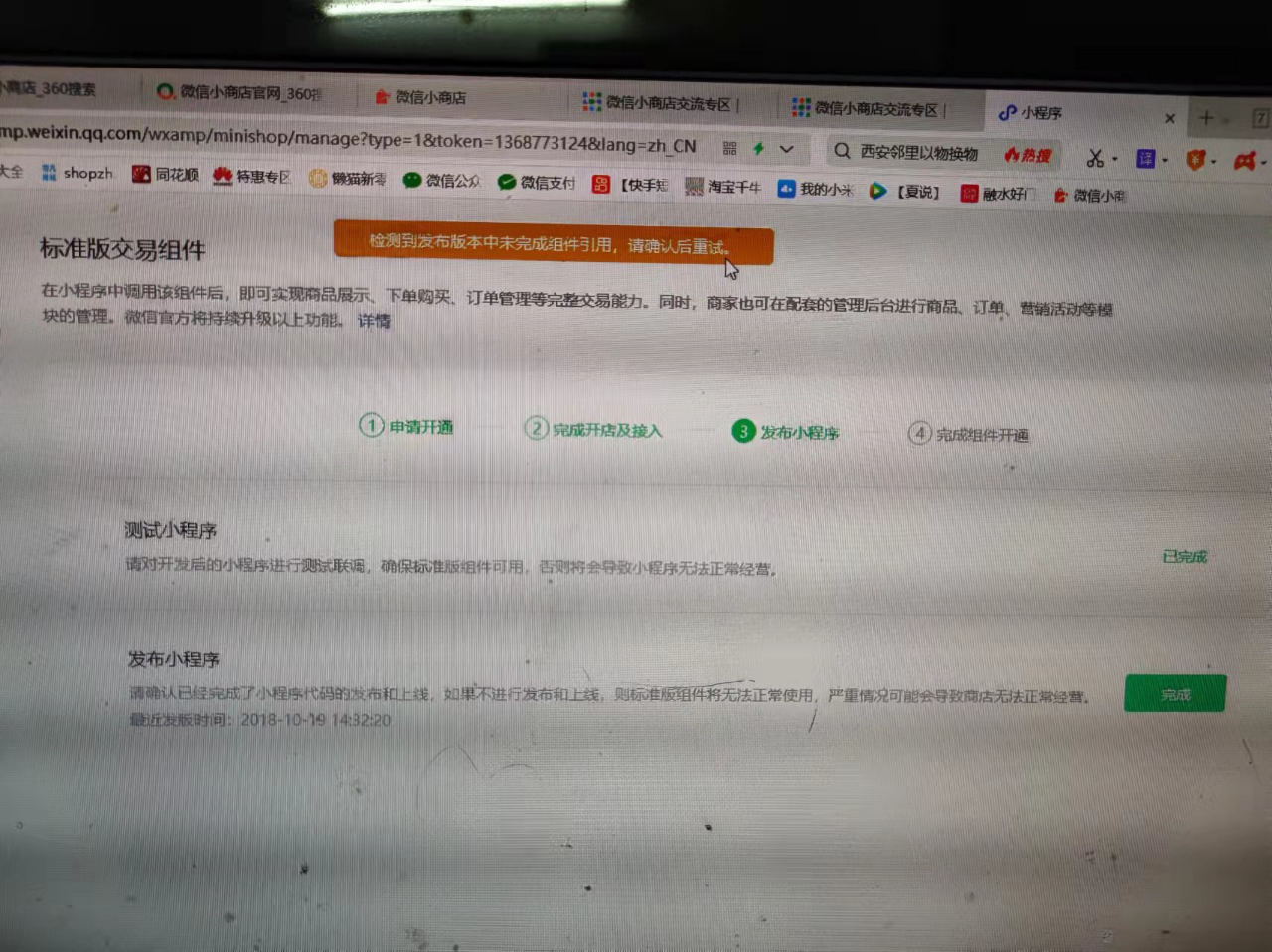 在微信小程序后台交易组件-发布小程序提示;,扫小程序码出现,在微信小商店,进入本店显示,求解决.