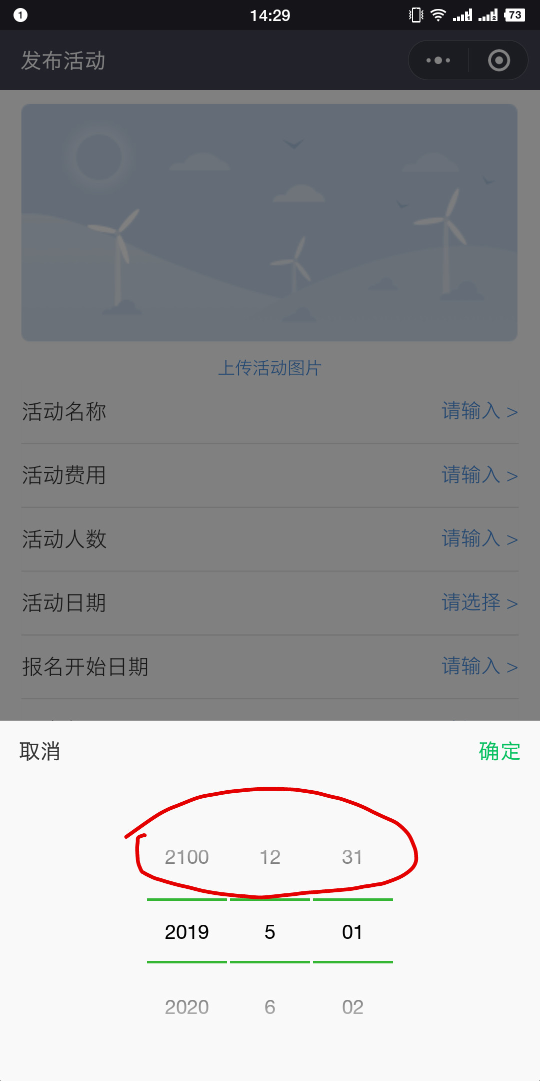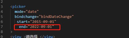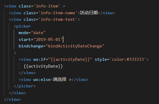 <picker mode="date" start="2019-05-01" bindchange="bindActivityDateChange" > <view wx:if="{{activityDate}}" style='color:#333333'> {{activityDate}} </view> <view wx:else>请选择 ></view> </picker> |