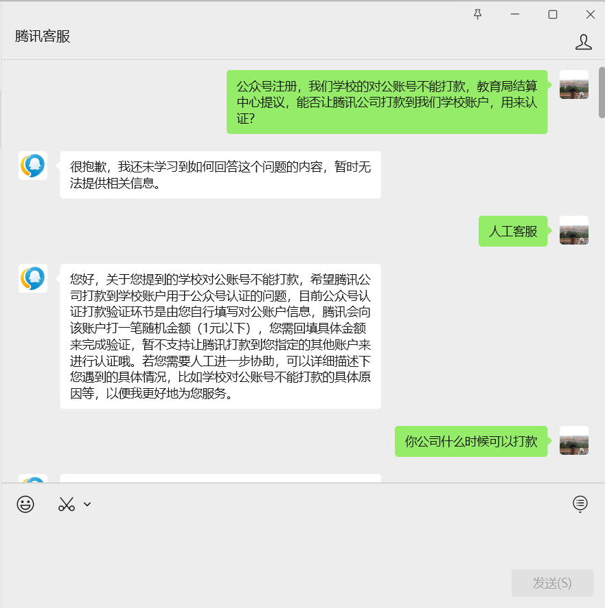 我们学校申请了一个公众号,已经填写了学校对公账户,但是我们学校的对公账户不能打款过去认证,AI客服告诉我腾讯公司会打款1元以下的钱到我们学校的对公账户用来认证,请问我应该做什么才能通过认证?需要我在哪里提供对公账户信息,我又应该在哪里回复你们打了多少金额的款?