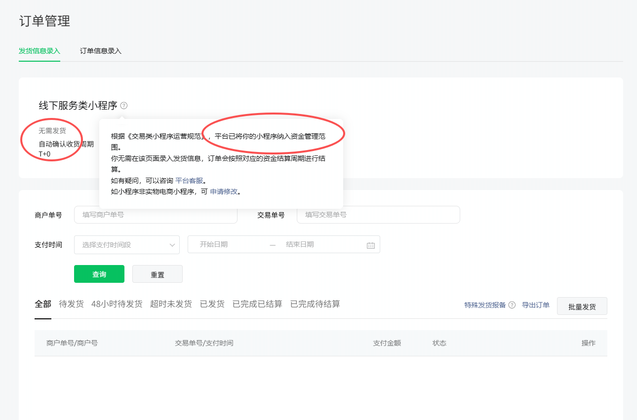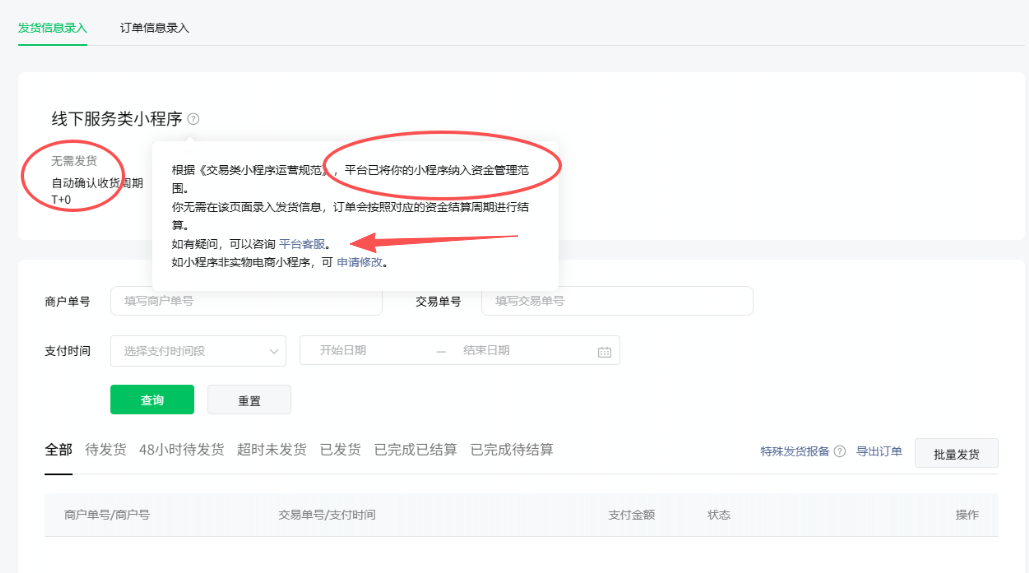 商家可在该路径进行咨询下哈,路径:小程序管理后台https://mp.weixin.qq.com/ 支付与交易-订单管理-发货信息录入/订单信息录入-【实物电商类小程序】旁边的问号-平台客服咨询