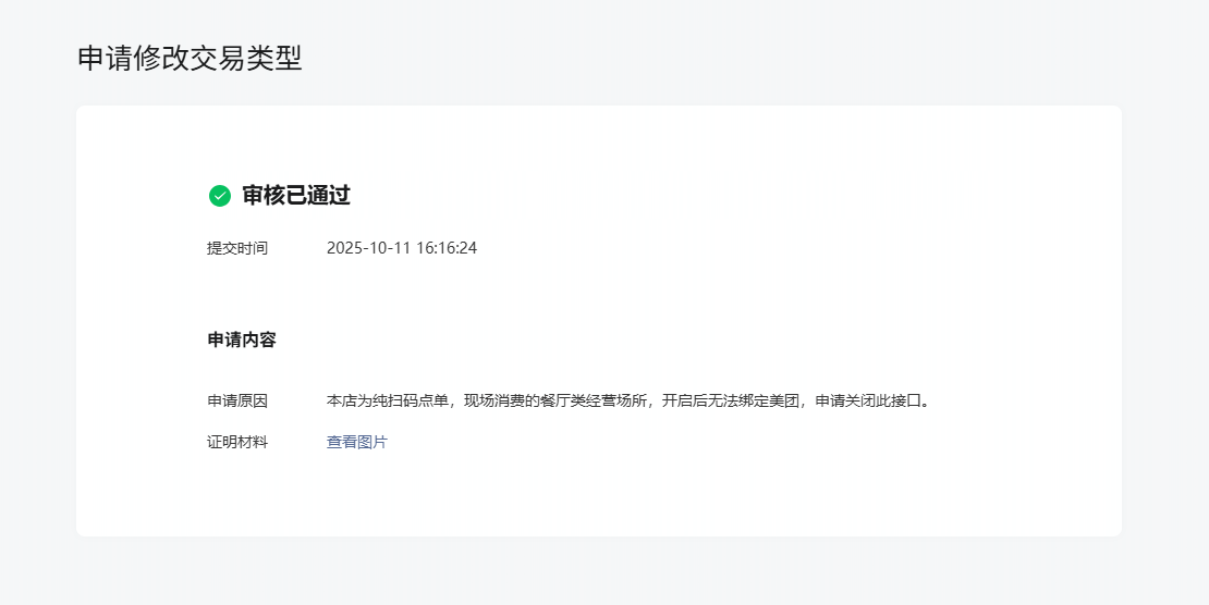 分析应该是虽然关闭了无需发货,但资金T+0当中给,但账号仍在监管中,导致无法使用美团第三方支付,特申请再次全部关闭此功能,且通知相关审核人员,避免后续其他商户无法正常使用,谢谢!