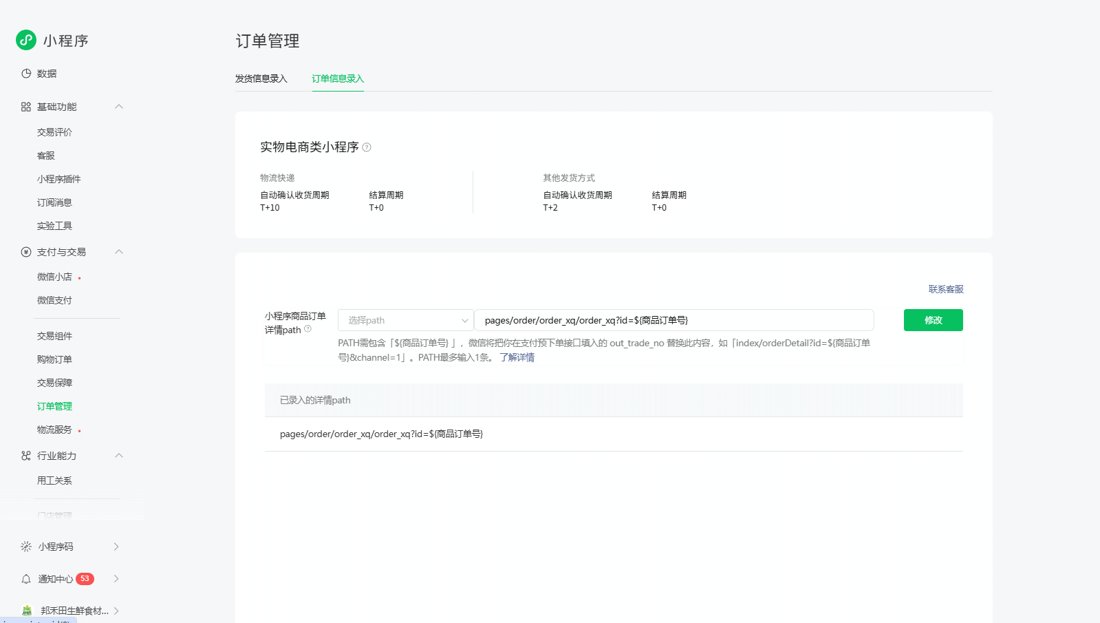 商家可在该路径进行咨询下哈,路径:小程序管理后台https://mp.weixin.qq.com/ 支付与交易-订单管理-发货信息录入/订单信息录入-【实物电商类小程序】旁边的问号-平台客服咨询