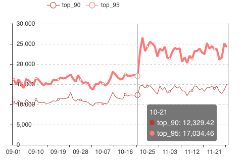 我们发现,在10月19号上新代码那会儿页面scan_to_load 时长都是比较平稳的,但是22号切换二维码路径之后,scan_to_load 激增:Top 95线上升 5-6s,Top 90线上升3s左右。