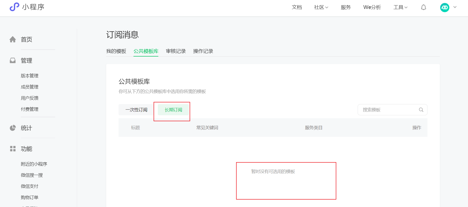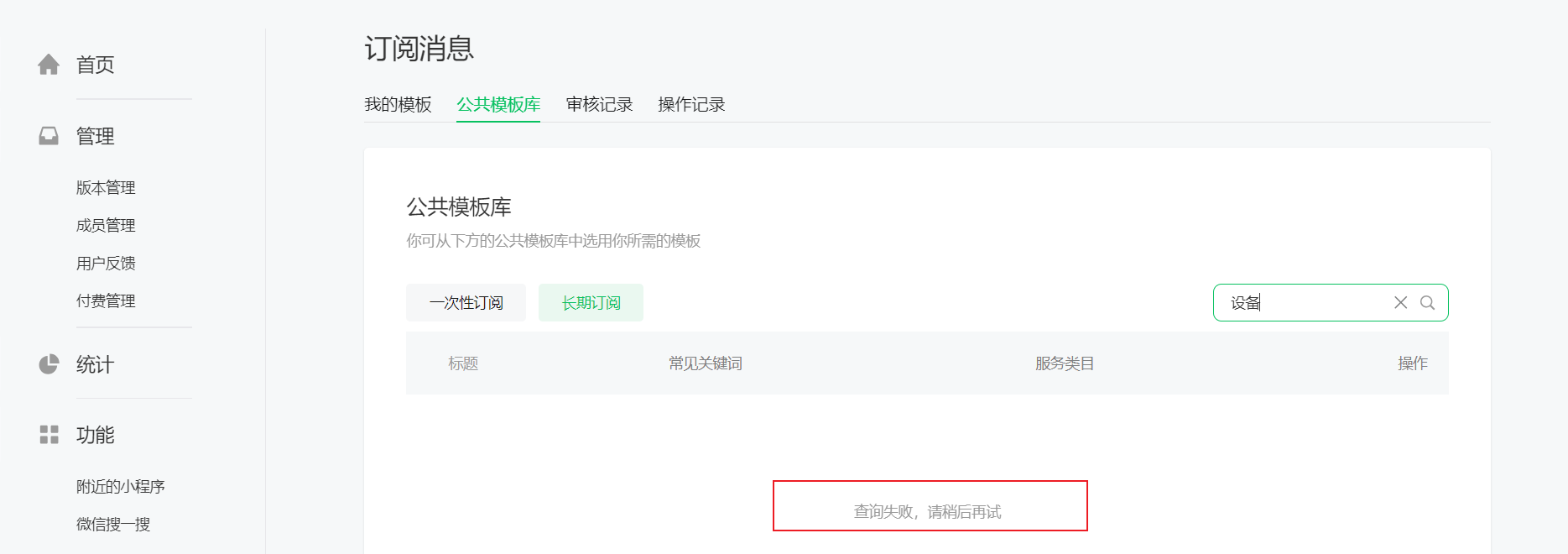 硬件设备申请的设备和消息能力审核已通过(下图1),但是在订阅消息的长期订阅没有看到相应的模板(下图2),搜索也提示查询失败(下图3)