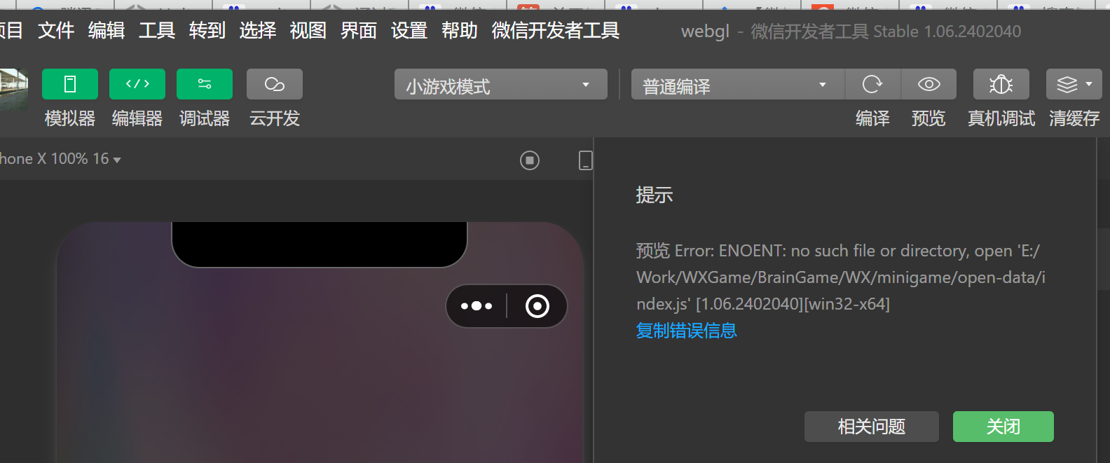 预览 Error: ENOENT: no such file or directory, open 'E:/Work/WXGame/BrainGame/WX/minigame/open-data/index.js' [1.06.2402040][win32-x64][win32-x64]