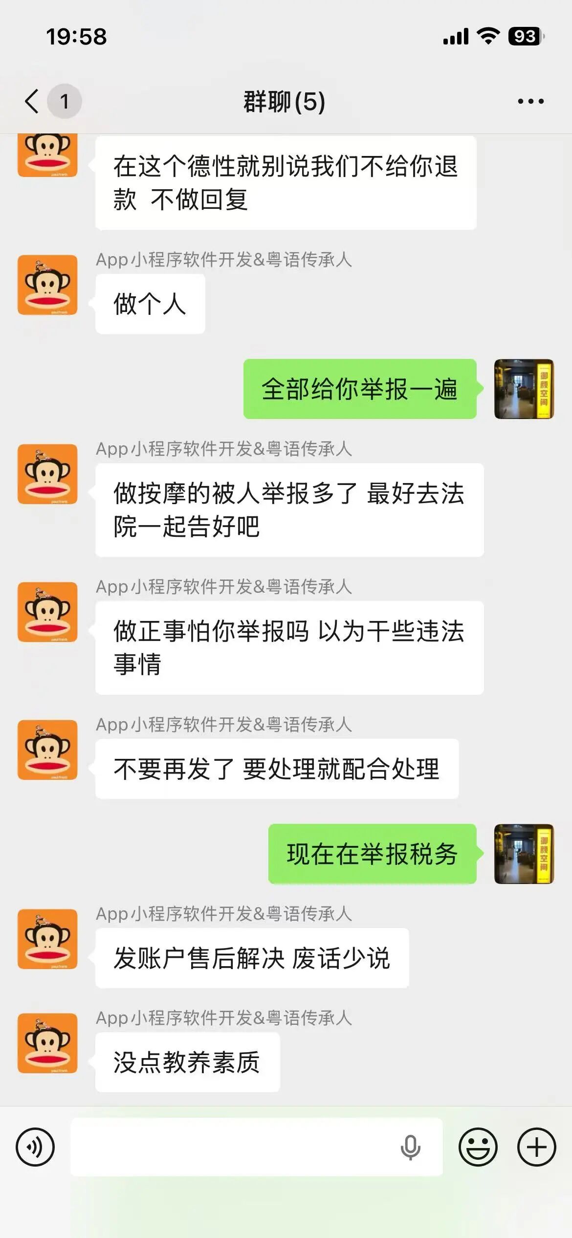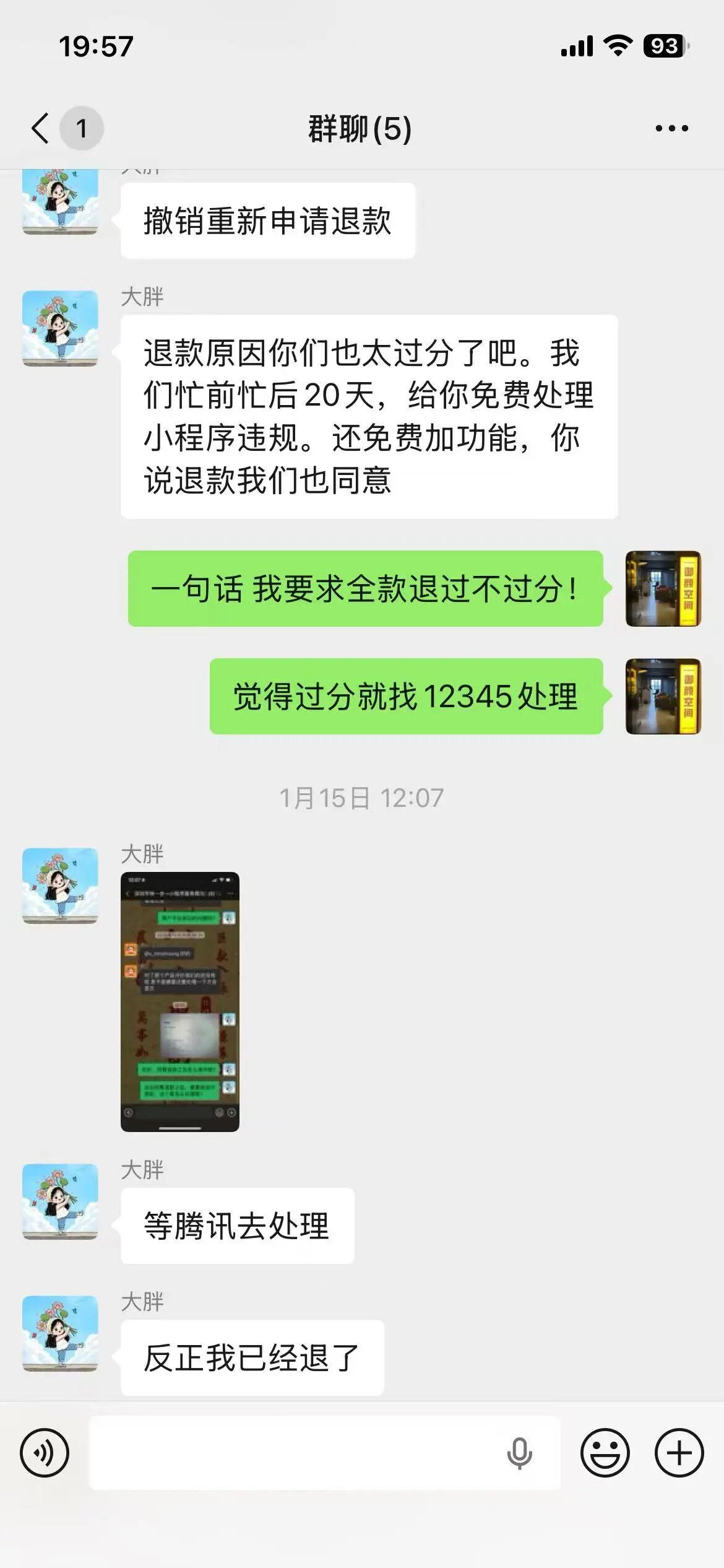 2025年12月25日购买深圳市快一步科技有限公司服务前咨询就是搭建上门按摩的小程序。上门按摩的小程序经过前后1个月时间搭建,商家还没上线就被微信服务小程序官方因为上门按摩类目不能入驻而被强制下架 商家花的1980元钱找深圳市快一步科技有限公司搭建 小程序被下架必须全额退款!已经超过了7天无理由了,官方不给介入监管售后问题,深圳市快一步科技有限公司不肯退款,官方和服务商简直就是不把商家消费权益放心上,太可恶了。大家不要上当受骗!我是咨询服务商说做上门按摩小程序,服务商处理小程序的装修期间和商家提问相当怠慢,拿了钱就不办事的态度很明显。小程序还没上线就被微信服务小程序官方因为上门按摩类目不能入驻而被强制下架,虽然不是技术服务问题的范畴,但是我先表明要服务商做上门按摩小程序的,现在又不能上线。7秋英无理由过了以后,平台居然叫商家和服务商自己匀协商处理。 服务商迟迟不退款,还说再催就不退款了 。导致我们商家损失所以主张退全款。服务商答应退款确迟迟不到账,还骂商家