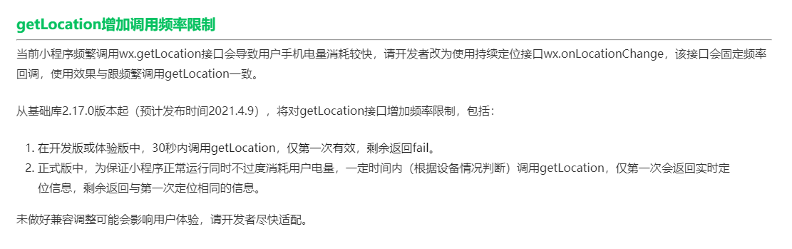 从基础库2.17.0版本起(预计发布时间2021.4.9),将对getLocation接口增加频率限制,包括: