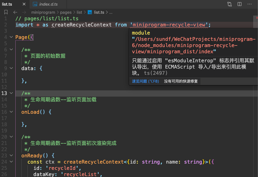 在TypeScript项目中,使用recycle-view扩展组件导入时,报错提示只能通过启用 "esModuleInterop" 标志并引用其默认导出,使用 ECMAScript 导入/导出来引用此模块。ts(2497)可以正常使用,只是报一个这样错误。tsconfig.json配置是这样的