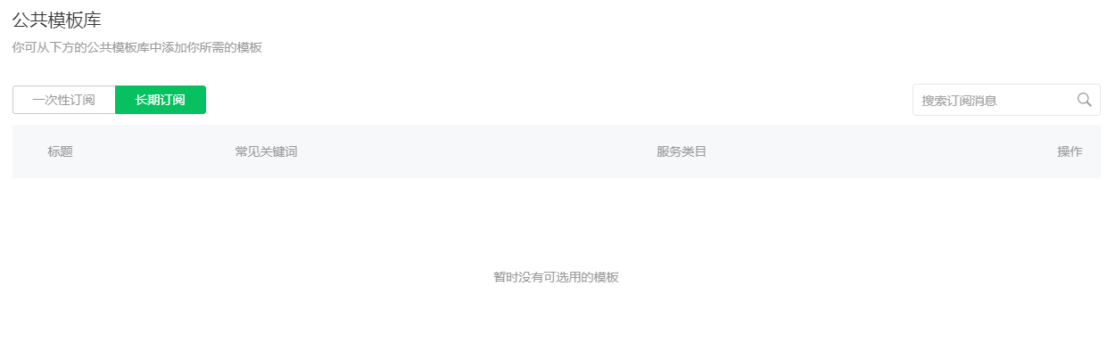 你好,长期订阅消息模板现在只对政务民生、医疗、交通、金融、教育等线下公共服务开放。 意思是: 你需要先提交审核相关类型的小程序类目,审核通过后再进行长期订阅模板的申请, 再审核,通过后就可以使用了