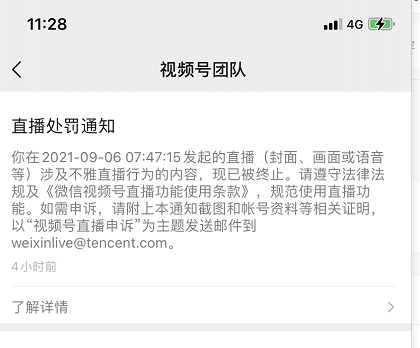 视频号直播限流了,官方说是涉及不雅直播行为包括封面画面语音不知道具体是什么原因?邮寄也给官方发了,也没有回复,什么时候能给个确切回复啊