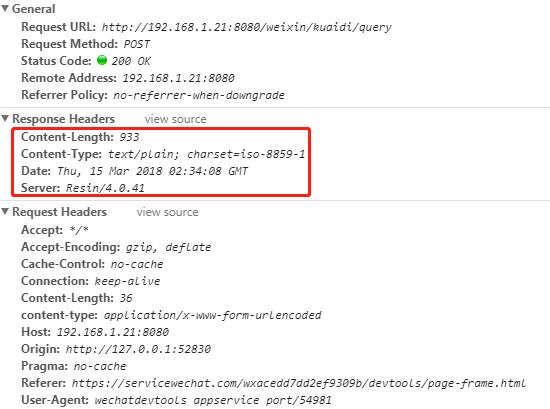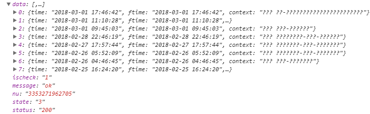 wx.request({ url: app.globalData._server + '/weixin/kuaidi/query', method: 'POST', dataType:'json', // responseType:'arraybuffer', header: { "Content-Type": "application/x-www-form-urlencoded" }, data:{ expCode: SHOPPING_NAME, expNo: SHOPPING_CODE }, success: function (res) { wx.hideLoading(); that.setData({ wulMesge: res.data.data }); console.log(res.data.Traces); } }); |