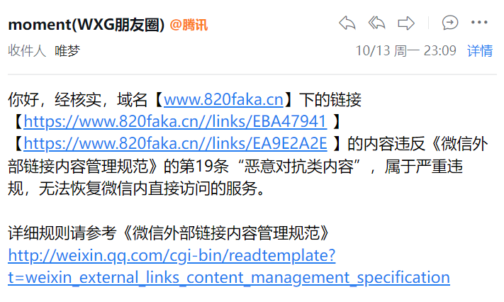 是我司业务所使用域名,网站提示网页包含恶意欺诈内容,为维护绿色上网环境,已停止访问?,我司积极自查,网站没有违规行为,所有域名经过腾讯安全管家检测均为安全域名。具体截图如下,上周提交申诉反馈为域名下的链接的内容存在违反《微信外部链接内容管理规范》的第6条“欺诈类内容”,我司已经停止该内容,希望可以人工重新审核