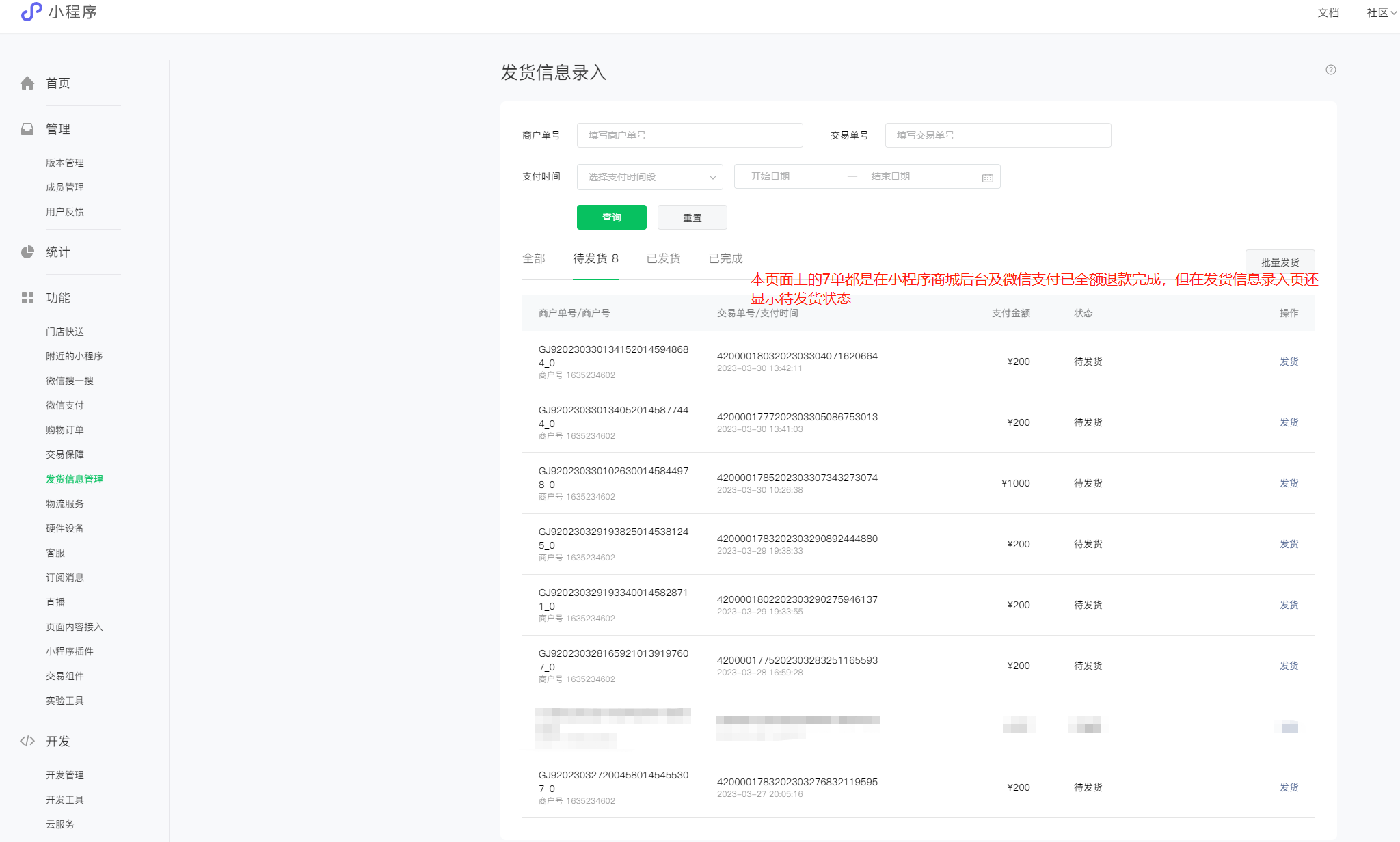 交易类小程序已退款的订单在发货信息管理里还显示待发货状态