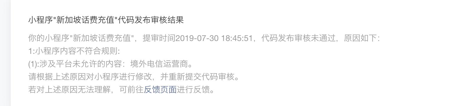 你好,经核实,贵方小程序确实涉及平台未允许的内容:境外电信运营商。 贵方反馈的情况会同步转相关工作人员核实处理