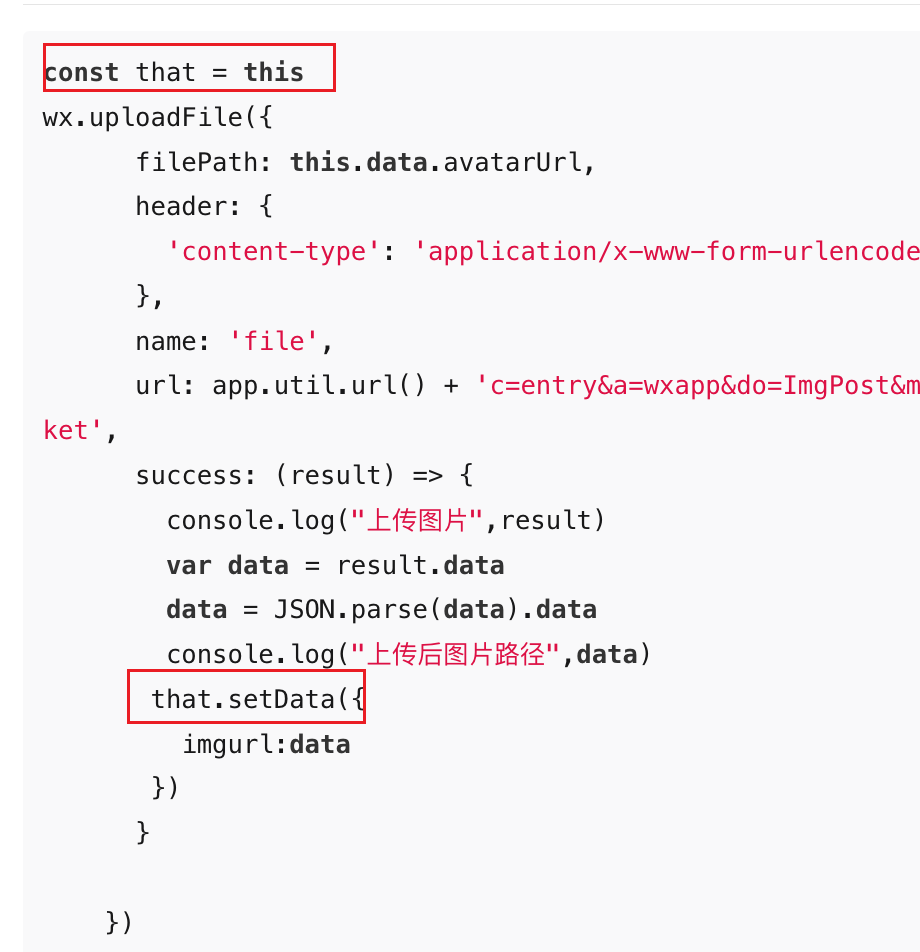 const that = this wx.uploadFile({ filePath: this.data.avatarUrl, header: { 'content-type': 'application/x-www-form-urlencoded' }, name: 'file', url: app.util.url() + 'c=entry&a=wxapp&do=ImgPost&m=gc_market', success: (result) => { console.log("上传图片",result) var data = result.data data = JSON.parse(data).data console.log("上传后图片路径",data) that.setData({ imgurl:data }) } })上传函数外层重新定义 this 变量。