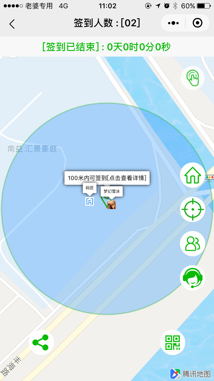 2、用户在小程序里点击签到,会获取用户当前的经纬度以及活动集合的地点,然后计算两者的距离是否符合签到范围,如果符合签到范围的半径就签到成功,否则签到失败;