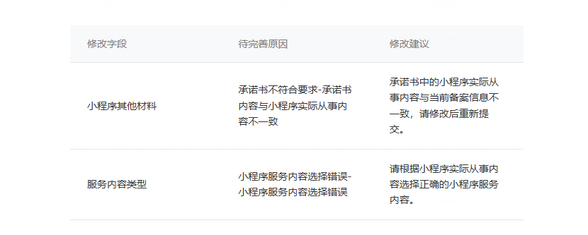 备案修改提示:小程序服务内容选择错误,修改建议为请根据小程序实际从事内容选择正确的小程序服务内容。