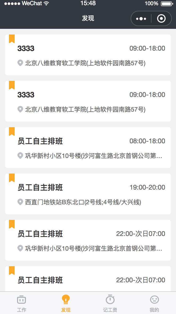 我们检查小程序之后哦,觉得可能是发现tab没有具体数据展示导致的,如果想要体验发现功能,需要去http://vip.doumi.com注册账号并且创建项目发布工作,并且将测试账号添加到项目,设置完成之后,发现页面将会如下展示,