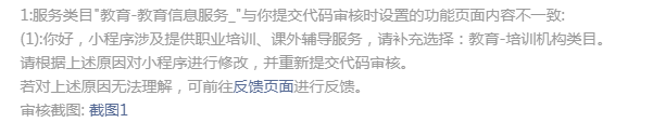 小程序属于宣传和内部人员使用,而且我们是教育咨询机构,为何需要培训机构类目?而且每次审核不过的原因都不一样,前几个星期还可以审核通过的,就改了几个BUG提交审核就出现各种原因不通过,麻烦审核人员看一下,谢谢。