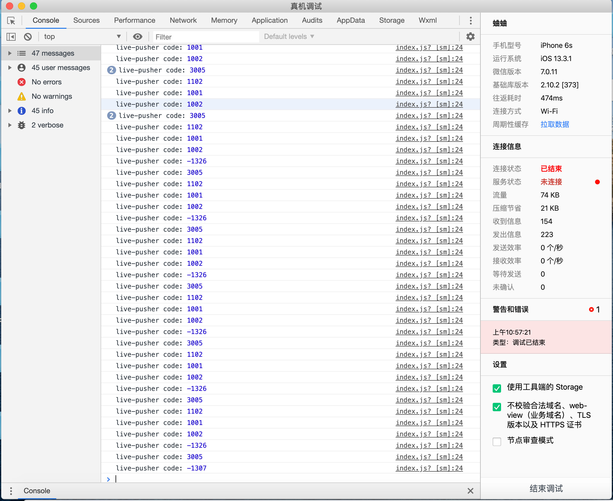 live-pusher code: -1307 表示网络断连,且经三次抢救无效,可以放弃治疗,更多重试请自行重启推流