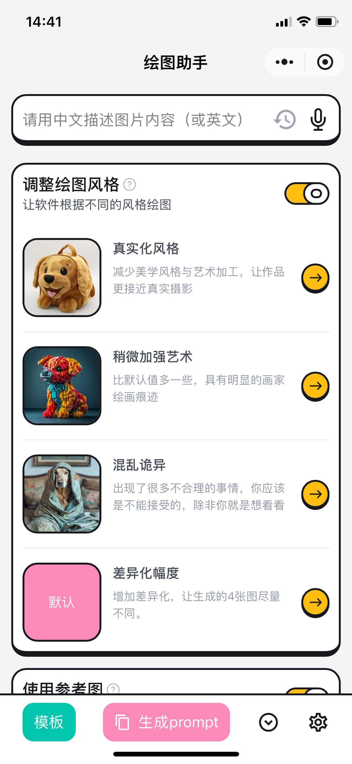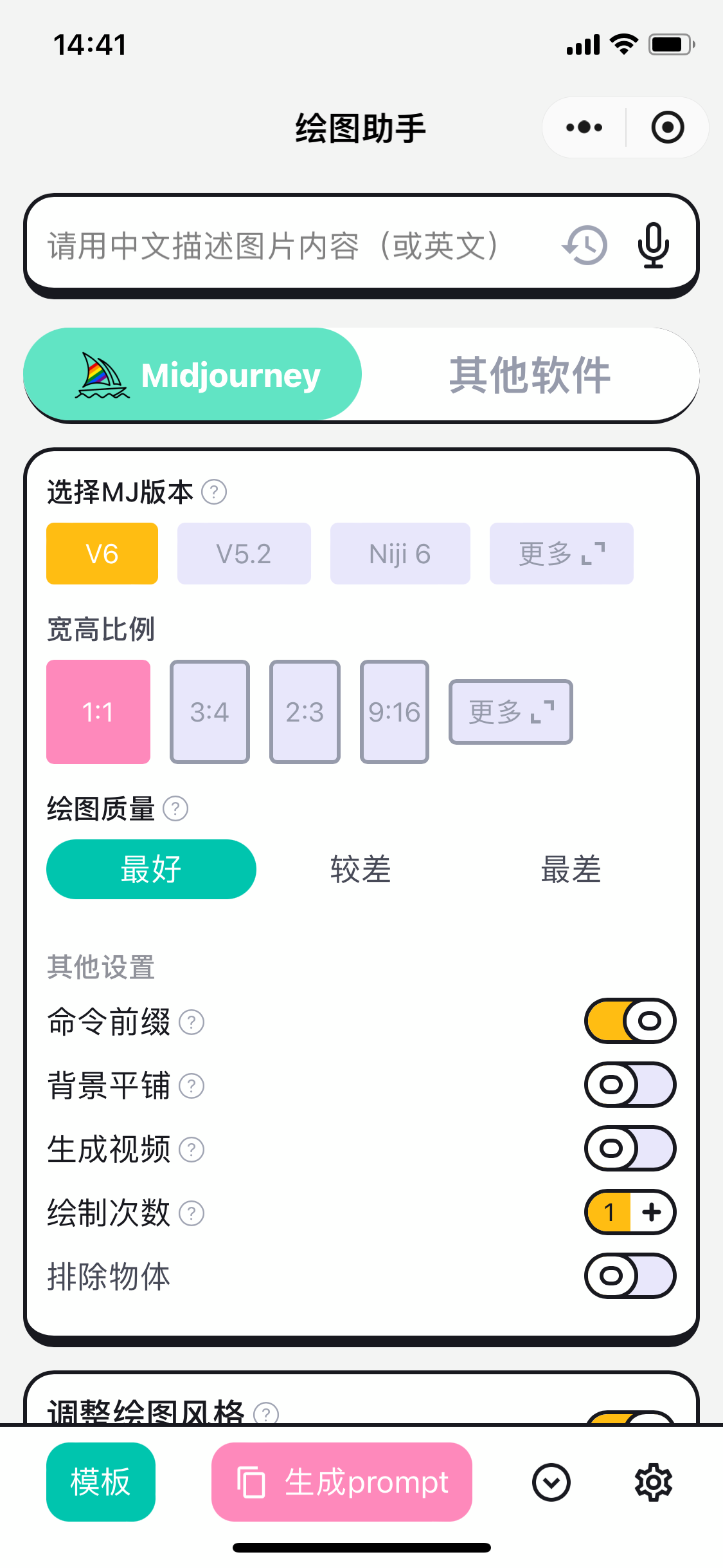 这个小程序的功能就一个:生成 Midjourney 提示词。你需要配合 Midjourney 软件使用。
