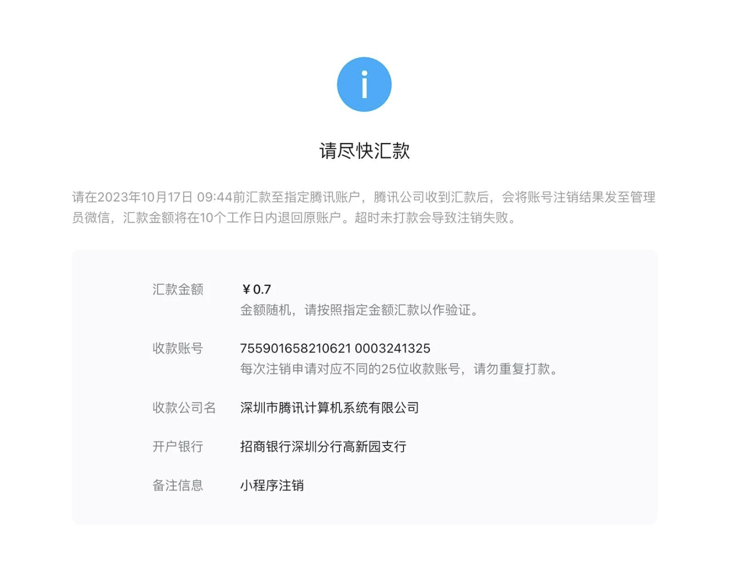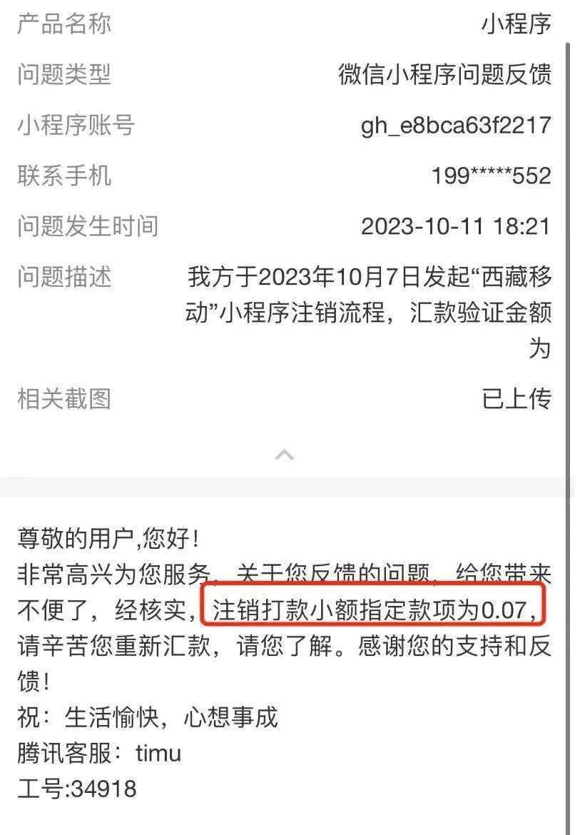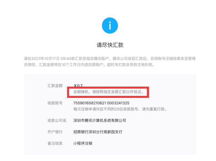 我公司于2023年10月7日发起小程序注销流程,系统提示需小额汇款验证且验证金额为0.7元(截图一);我公司对公账户成功汇款0.7元,2023年10月11日反馈注销结果为验证失败,失败原因为“汇款金额和指定金额不一致,本次打款无效”(截图二);我公司打款金额与后台随机金额一致却提示此报错,烦请核实。