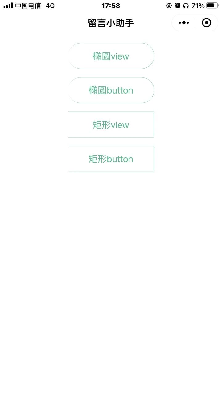 /* pages/index/test.wxss */.button{font-weight: normal;font-size: 32rpx;display: flex;justify-content: center;align-items: center;border: 1rpx solid #2CBF8E;background: none;border-radius: 44rpx;height: 88rpx;width: 292rpx!important;margin: 30rpx auto;color: #2CBF8E;}.button2{font-weight: normal;font-size: 32rpx;display: flex;justify-content: center;align-items: center;border: 1rpx solid #2CBF8E;background: none;height: 88rpx;width: 292rpx!important;margin: 30rpx auto;color: #2CBF8E;border-radius: 0!important;}给元素添加样式:transform: rotateZ(360deg)