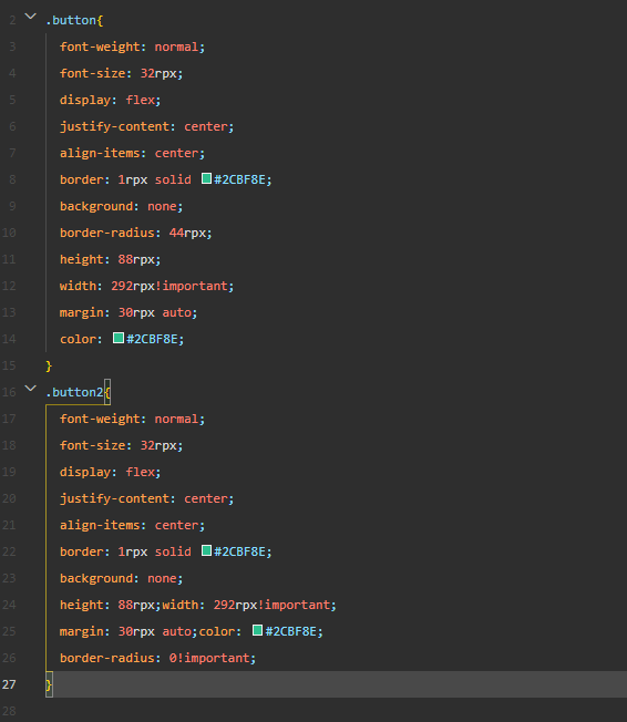 .button{font-weight: normal;font-size: 32rpx; border: 1rpx solid #2CBF8E; background: none; border-radius: 44rpx; height: 88rpx;width: 292rpx!important;}